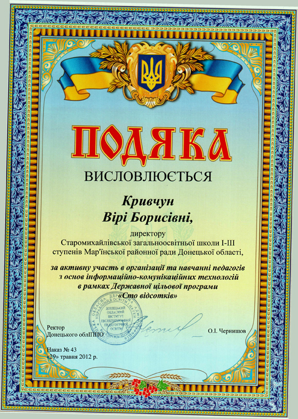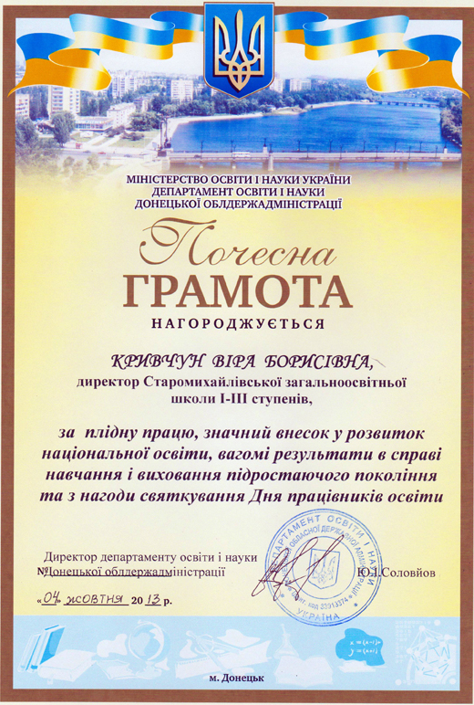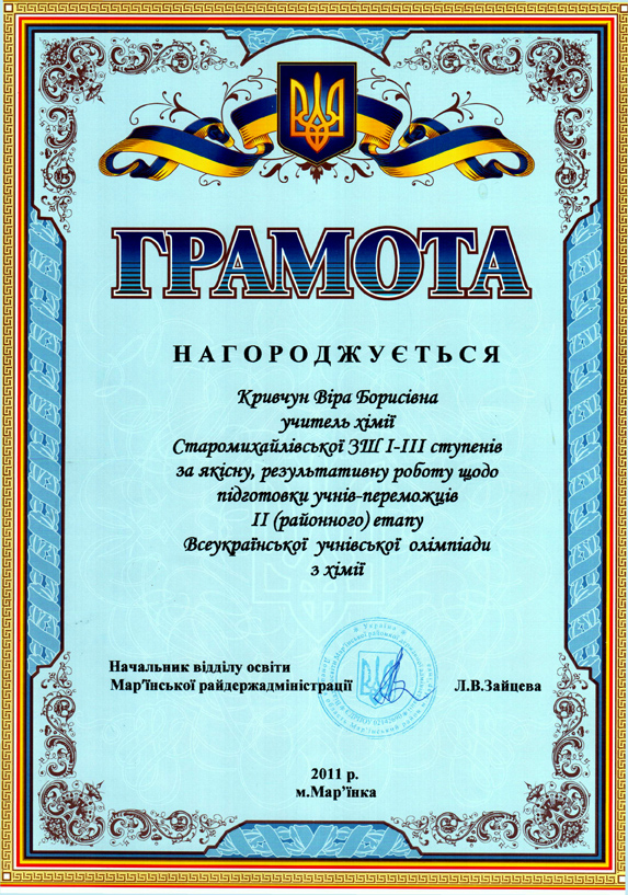освіта: ПОВНА ВИЩА, ДонДУ, хімічий факультет,1992р. спеціальність: ХІМІК. ВИКЛАДАЧ місце роботи: СТАРОМИХАЙЛІВСЬКА ЗОШ І-ІІІ ст посада: ДИРЕКТОР, УЧИТЕЛЬ ХІМІЇ стаж: 28 РОКІВ звання: СТАРШИЙ УЧИТЕЛЬ кваліфікаційна категорія: СПЕЦІАЛІСТ ВИЩОЇ КВАЛІФІКАЦІЙНОЇ КАТЕГОРІЇ